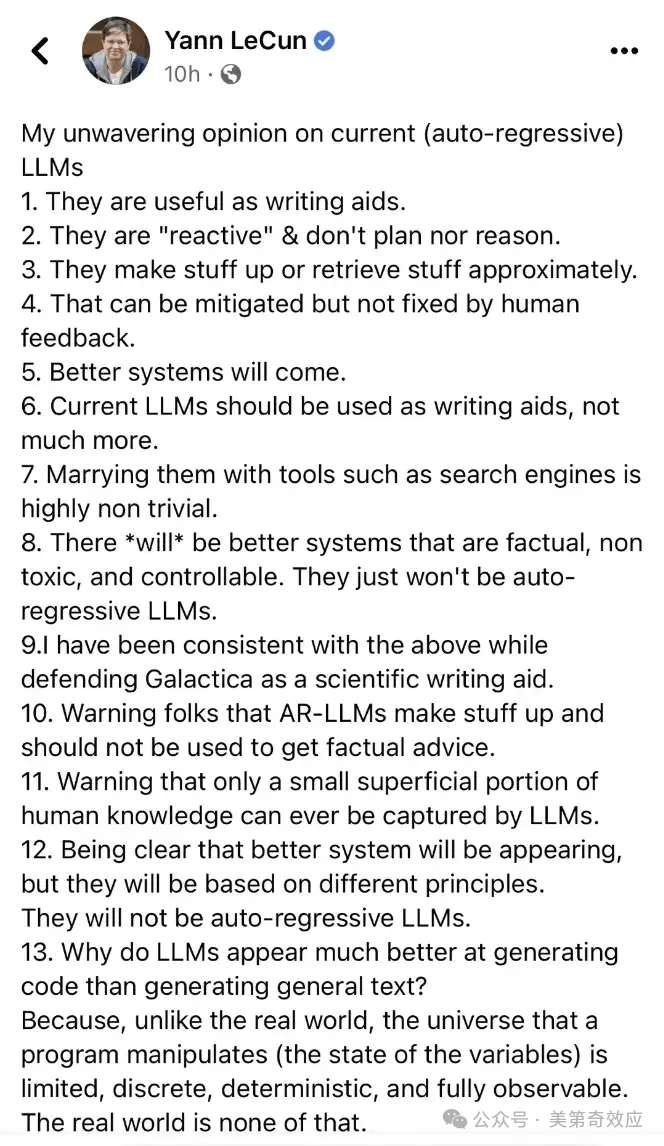 房間裏的大象,或者AI的皇帝新衣的根本,就是目前的生成式LLMs 的AI體系,完全就是個寫作助手一樣的東西。AI大牛,生成式AI的開山祖師爺,Yann LeCun在推特上對目前的ChatGPT 和類似的大模型蓋棺定論:
