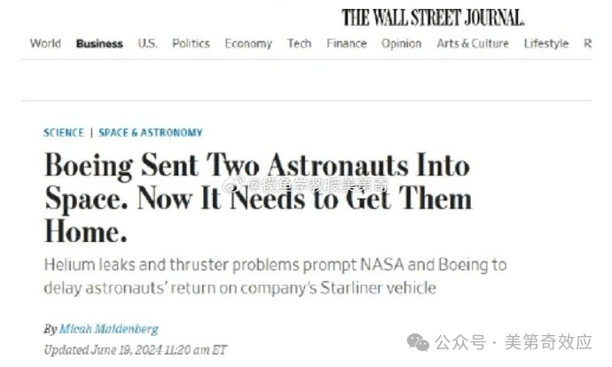 華爾街日報最近發大字報炮轟波音: 波音把兩名宇航員送到了空間站,現在它需要把他們帶回來。這兩名被困空間站的宇航員,原本説18號回來,後來改到22號,然後推遲到26號,現在26號也回不了了,無限期延遲。50年前能帶倆人上月球,現在把倆人從近地軌道帶回來都做不到了?無敵的AI呢?