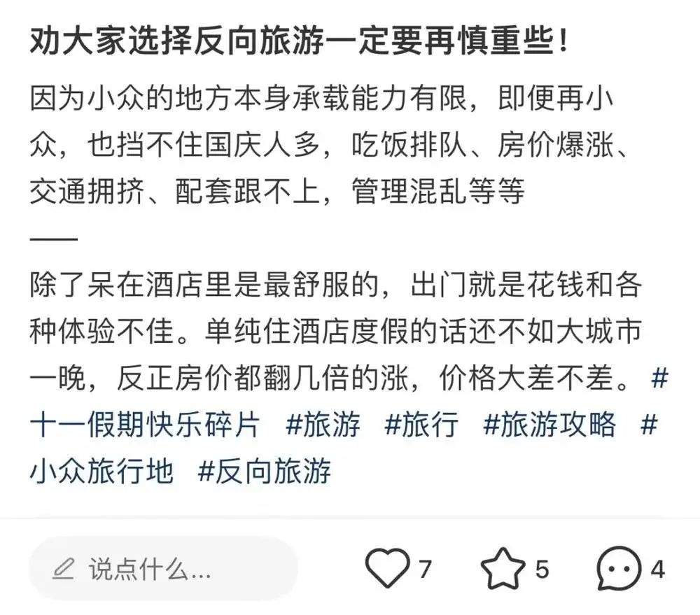 面對全國各地蜂擁而至的遊客,**縣城的過載情況比北上廣必定有過之而無不及。**不想擠在地鐵線上的人最後堵在了縣道上,不想住北京貴价快捷酒店的人最後住進了老闆含淚賺兩千的天價民宿。