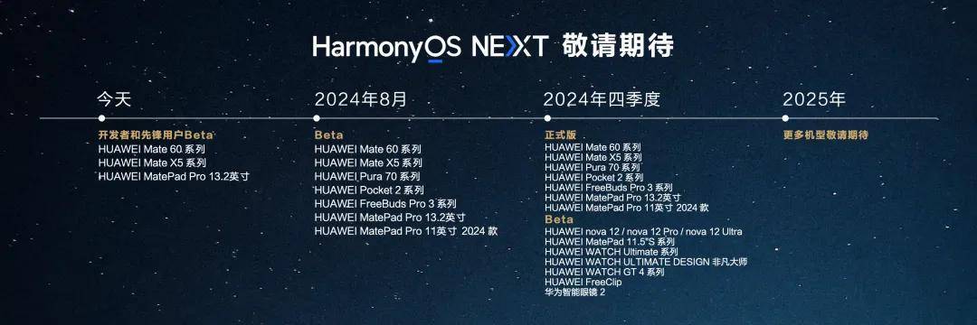 鴻蒙速度還在延續。這次HDC,HarmonyOS NEXT面向開發者和先鋒用户的Beta工作正式啓用, 據悉8月份將會啓動對於消費者的Beta,並且今年第四季度隨着Mate 70系列的上市,HarmonyOS NEXT走向大規模商用, 2025年將有更多的機型全面的升級和支持HarmonyOS NEXT。