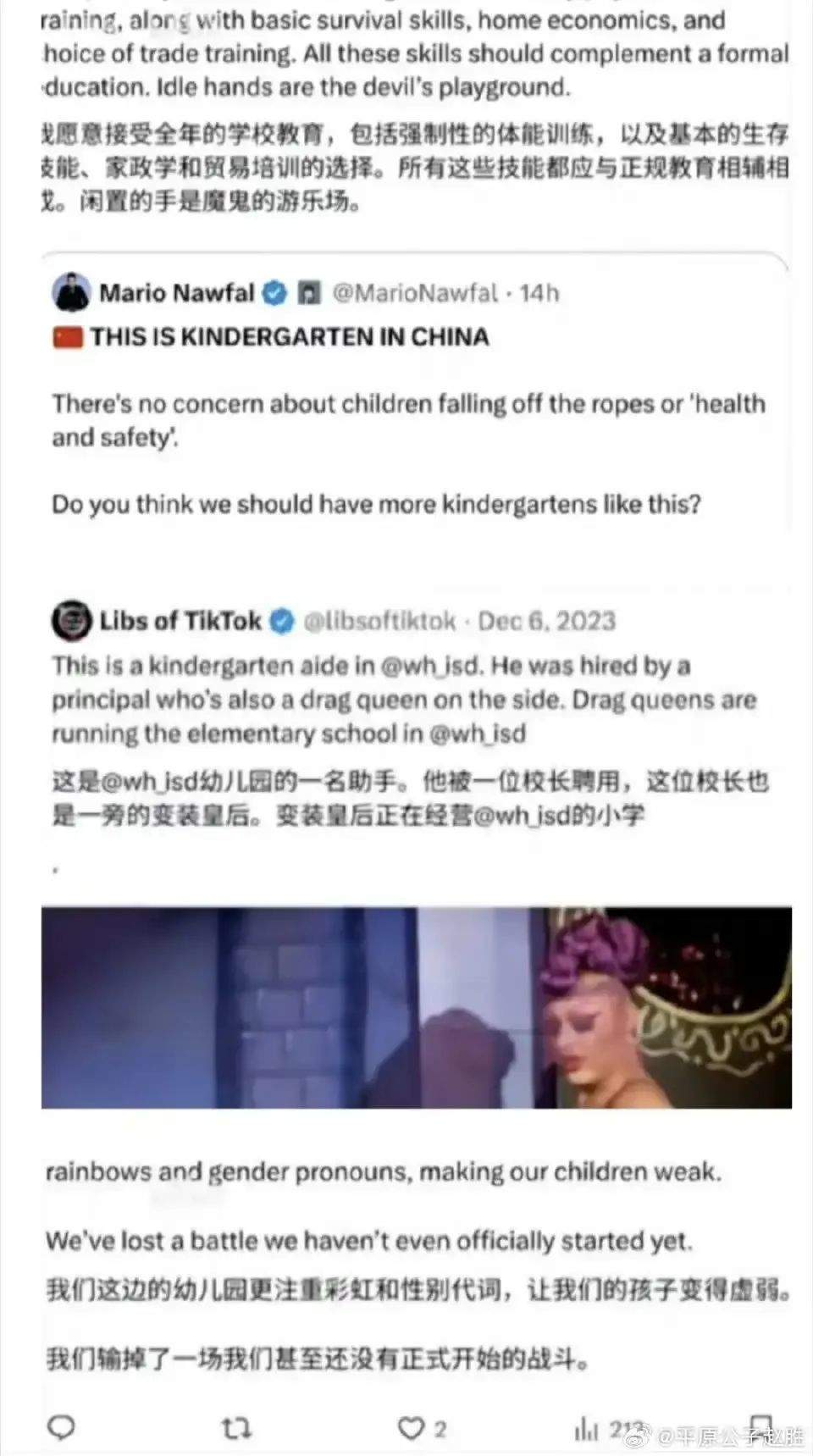 他們甚至還認為我國的幼兒園教育都是“特種兵”的教育,我們的小孩子都是能文能武、從小就掌握各種技能的超人……實際上,是他們自己痛心於他們垮掉的基礎教育、他們被LGBT瘋狂滲透的幼兒生活,所以,他們就對着視頻和圖片,腦補出了一個天頂星文明的東方大國,這確實是借他人酒杯,澆自己塊壘。