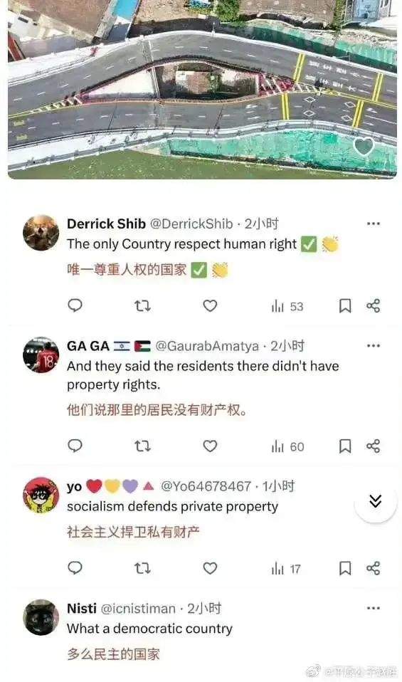 最離譜的是,某個釘子户被高速公路繞過的圖片,也被外國網友誇讚有加,他們説:“你看看,多麼民主的國家,社會主義才講人權,這才是真正的私有財產神聖不能侵犯”。