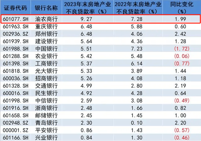 重慶農商行更是“兩連升”,2022年房地產業不良貸款率已經高達7.28%,2023年直接飆升到了9.28%。在一眾上市銀行裏高居榜首。