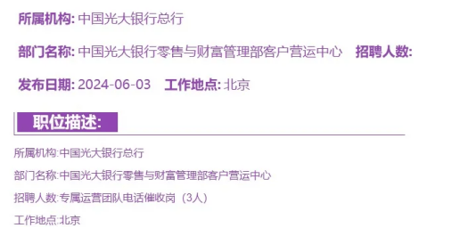 6月6日,光大銀行在官網發佈招聘信息,在北京地區社會招聘“貸款業務電話催收崗”3人。除了也要求大學本科學歷,這個崗位的所屬機構是光大銀行總行,拿的是“銀行正式編制”!