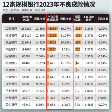 據“説財貓”統計,12家國內規模銀行中,去年不良貸款總額正增長的就有10家。
