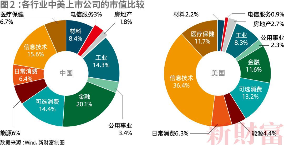 我們的上市公司市值構成中,金融行業憑20.1%的佔比遙遙領先。反而是金融大國美利堅,信息技術行業佔比高達36.4%,金融行業只佔11.6%。