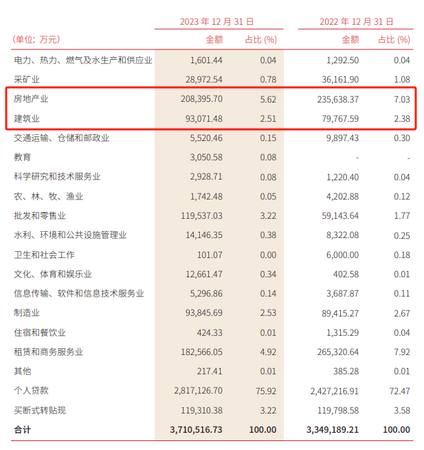 以三湘銀行為例,2023年房地產業、建築業貸款金額合計超30億元,在貸款餘額中佔比超8%。儘管年報中並未披露涉房貸款的不良情況,恐怕很難樂觀。