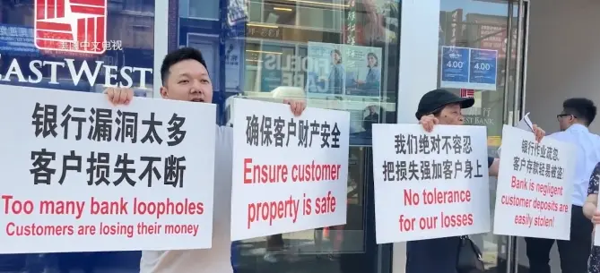 週五下午,多名華人因個人信息被盜導致銀行賬户金額損失的受害者在紐約法拉盛華美銀行門口抗議。