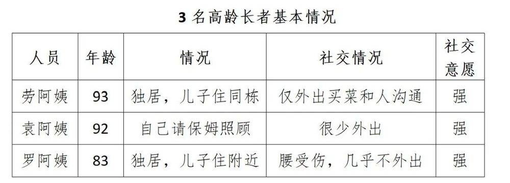 從3位長者的情況來看,勞阿姨年齡最大,但是她的精神狀態最好,筆者認為,這與她良好的社交狀態有關。勞阿姨是這3人中身體狀況最好的,她可以獨自去自己任何自己想去的地方,她擁有對自己生活的“掌控權”;同時,與其他人的溝通充實了她的生活,社交活動不僅為她提供了良好的情感支持,而且幫助她保持積極的心態。