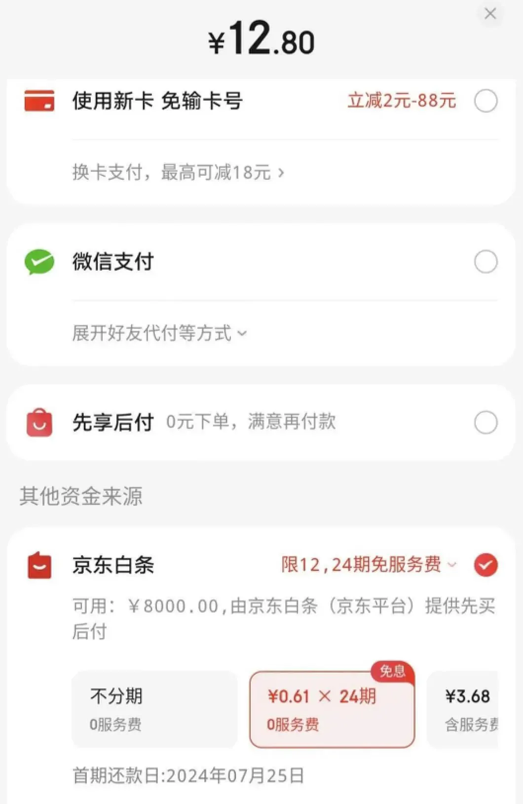 價格低至12.8元的某品牌活頁本也可以享受白條24期免息,每月僅需支付6角錢|圖源:京東付款界面截圖