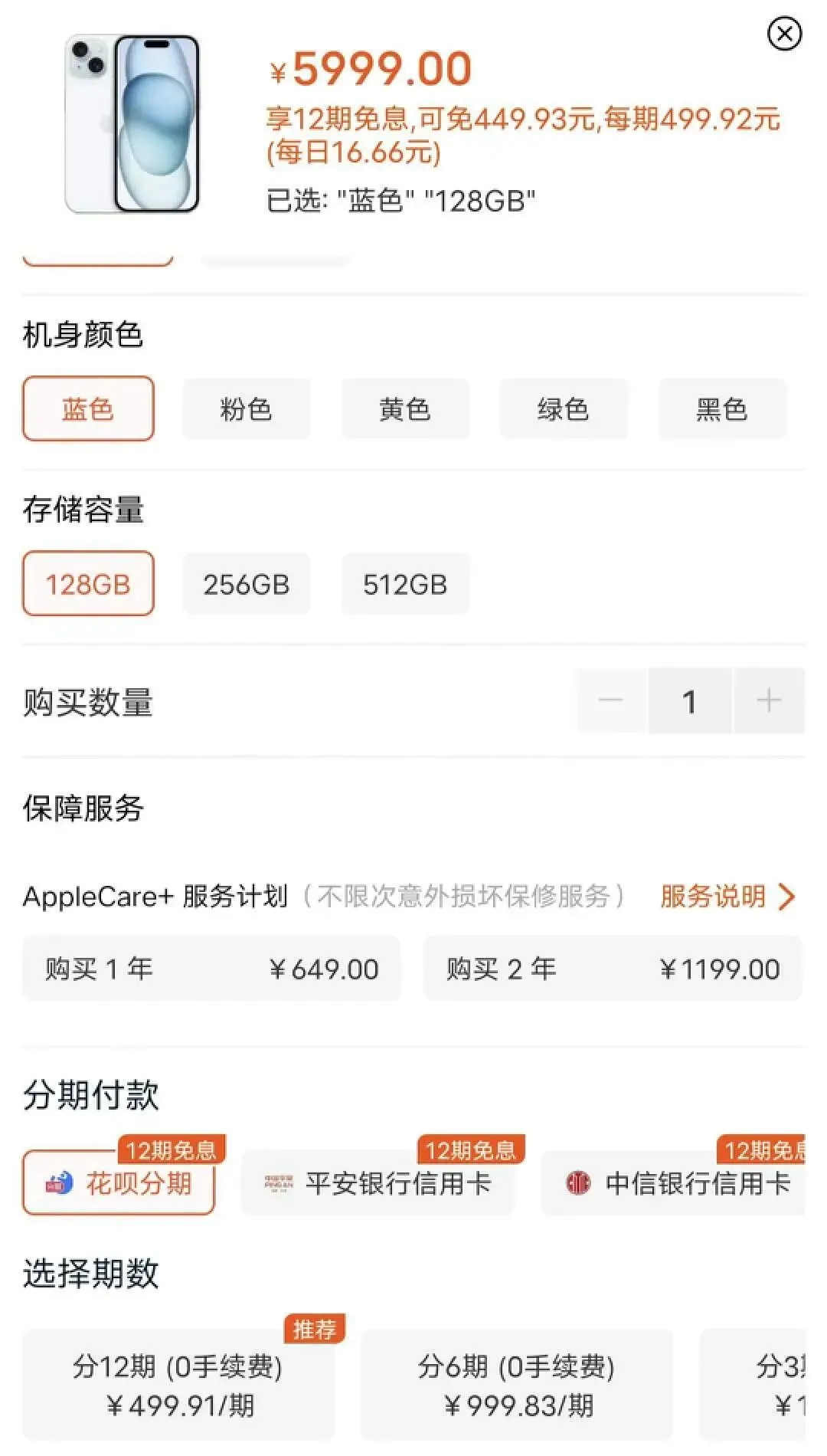 在淘寶,很多商家則會聯合螞蟻花唄和多家銀行信用卡,在大促期間為消費者推出分期免息服務。以蘋果官方旗艦店為例,一部價值5999元的iPhone15可在付款時選擇花唄分期或信用卡支付,最高可享12期免息,算下來一天只用還16.66元。