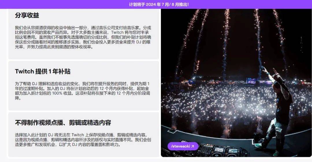 為了讓DJ們適應新的付費機制,不必擔心收入在短期內因平台規則下降,所有加入該計劃的DJ在第一年都會獲得Twitch的經濟補貼,用於彌補因版權分成造成的收益差額,後續每個月逐步減少。