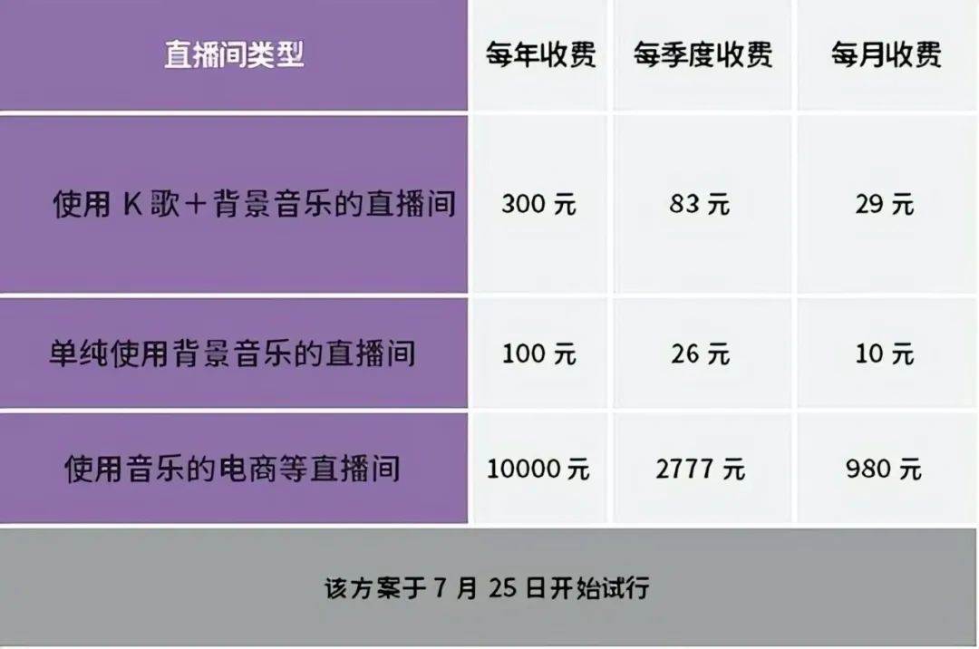 早在2022年7月25日,音集協就正式發佈《互聯網直播中使用錄音製品付酬標準(草案)》(以下簡稱《草案》),其中明確將直播間被劃分為三種類型:使用K歌和背景音樂的直播間、僅使用背景音樂的直播間,以及使用音樂的電商直播間。每年的收費標準分別為300元、100元和10000元;每季度的收費標準為83元、26元和2777元;每月的收費標準為29元、10元和980元。