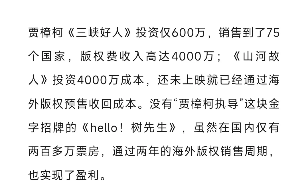 以法國為中心衍生出一條獨立電影全球產業鏈。以賈導為例,日本的北野武,法國的mk2發行公司,中國台灣的侯孝賢,中國香港的製作人周強,這些人幾近成了賈樟柯的貼身護衞。每有作品,紛紛出錢出工出力。mk2有全球的藝術院線發行網絡,侯孝賢有着全球的藝術人脈,日本藝術電影扛把子北野武,則資金穩定,為人仗義。周強身為製片人,一手將第六代推向了全世界,專業能力頗強。