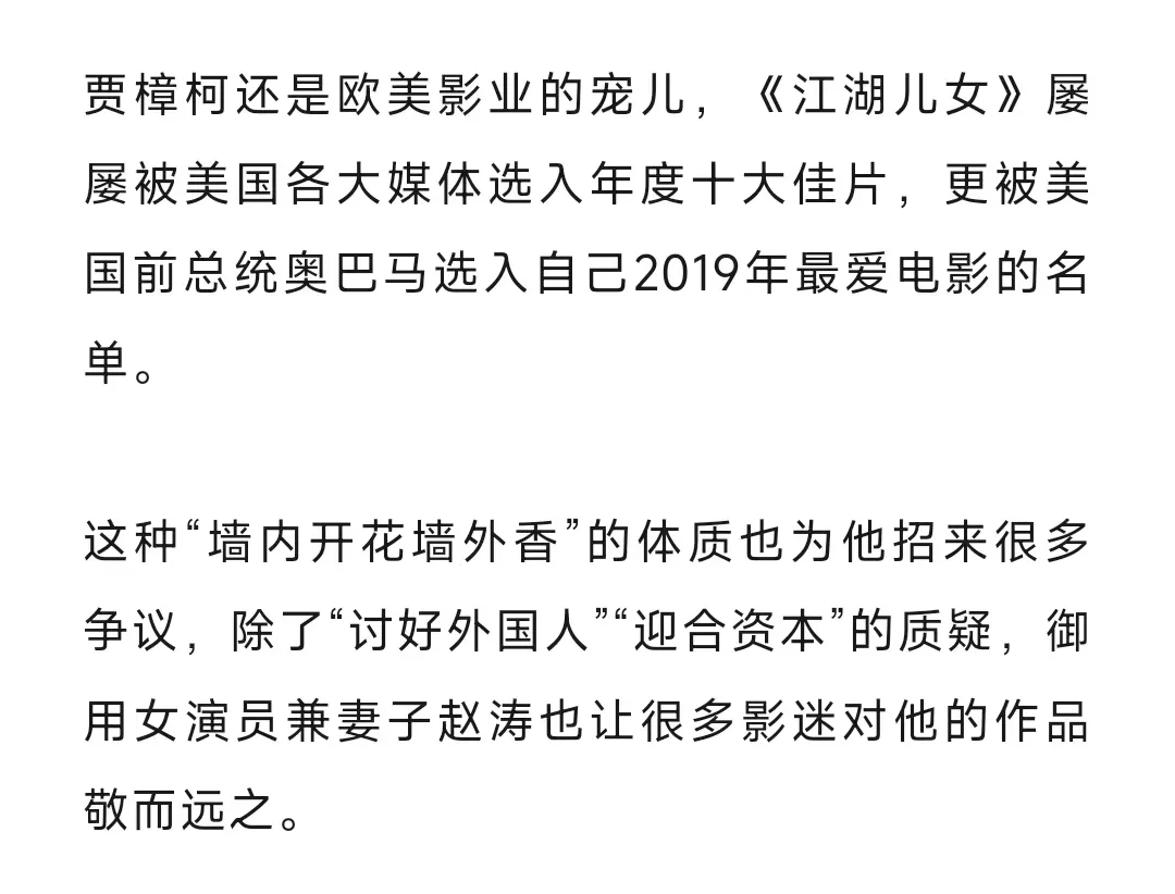 説來奇怪,賈導在作品質量、電影票房、社會地位上,都算不上是中國導演的扛把子。即使在文青們那裏,他也難稱是top1。在更為廣闊的視野裏,比他資歷深、水平高的幾位大導,無論主營商業電影還是藝術電影,也都沒有這麼跳脱,乃至屢上頭條,頻繁將自己立於危牆之下。所以,賈樟柯的底氣到底從來哪呢?