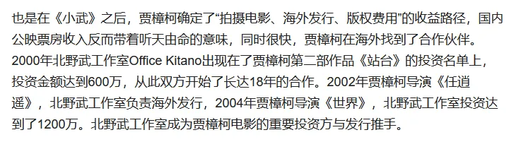 在他們的護航之下,賈樟柯一路攻城略地,片子還沒上映,就能收回成本。誇張一點,在北京房價只有兩三千的年代,北野武就直接給賈樟柯打了500萬。