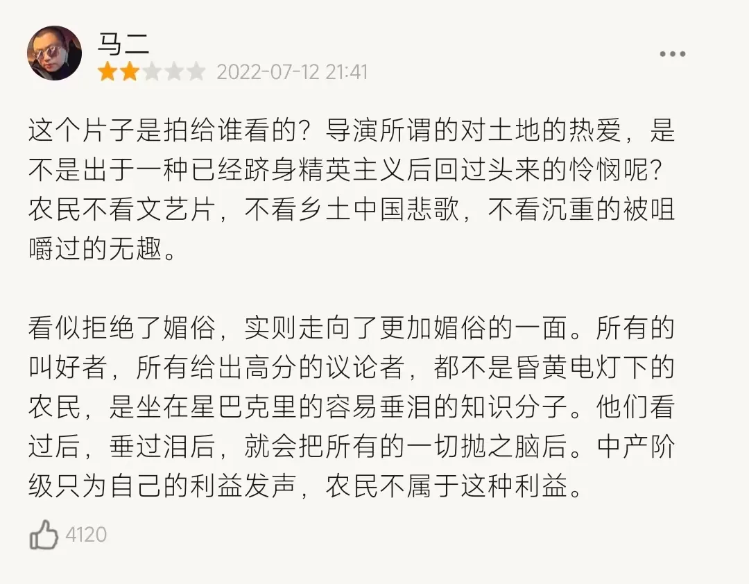 這種泛化的社會達爾文主義,表面上是關心先進的“弱者”,從工業社會回望農業社會,有着悲憫和同情。如果我們考慮他拿了誰的錢,片子牆內開花牆外香,本人呼朋引伴的實際情況,那麼,我們不難得出一個結論,他實際上確實是“出賣”工農,乃至把人家當酒桌上的菜了。