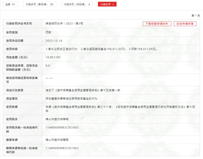 去年年底,**佛山復興禪城醫院因為存在重複收費等違法使用醫保基金的行為,**被當地醫保部門責令退回醫保基金108,611.05元,並罰款108,611.05元。