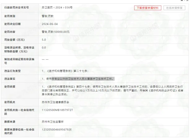 比如今年6月初,蘇州市衞健委就對復星醫藥控股的蘇州星健康復醫院有限公司進行了5萬元的處罰,緣由是該醫院使用“本專業以外的衞生技術人員從事醫療衞生技術工作”,類似於“無證行醫”了。在今年5月份,該醫院還因為超標排放社會生活噪音被蘇州生態環境局處罰過。