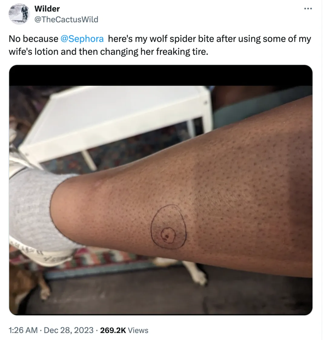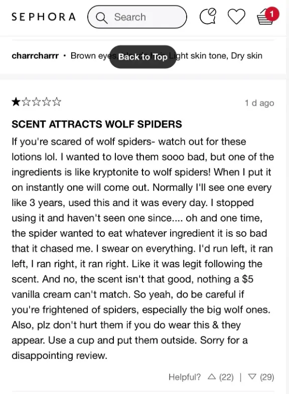 Reddit原文寫道:如果你害怕狼蛛,請小心這款身體乳,其中一種成分對狼蛛來説充滿吸引力。當我塗上它時,立刻就會有一隻狼蛛跑出來。我往左走,它就往左,我往右,蜘蛛就往右。感覺它是真的追着那個氣味。”|SEPHORA.COM