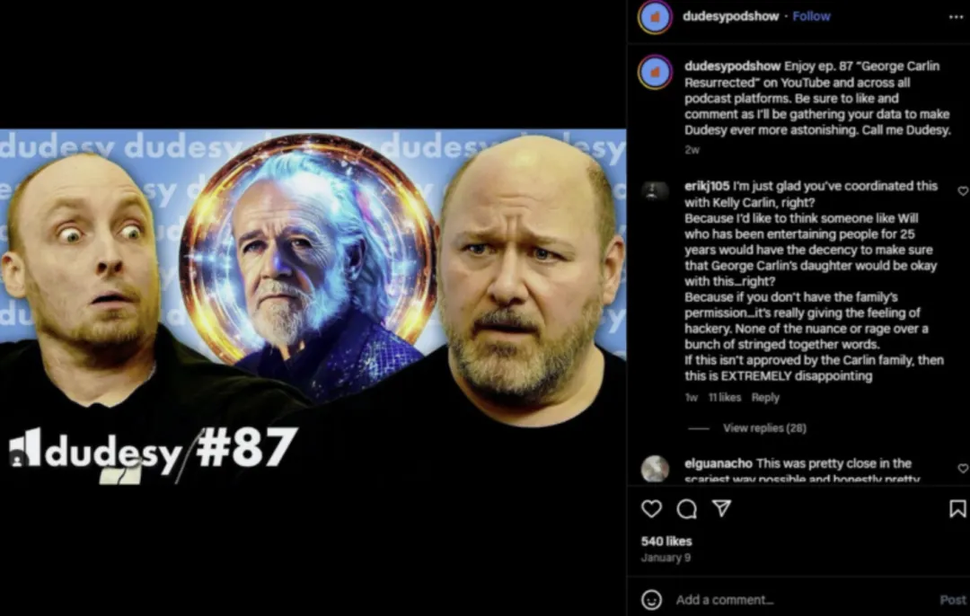 事實上,這不是第一次人類想要假冒AI(?)。今年年初,一檔節目聲稱由AI創作而成,據説是AI經過了一位已故脱口秀演員喬治·卡林的大量素材的訓練寫成的。結果被喬治·卡林的經紀人提起版權訴訟後,節目的發起人才承認:這個視頻內容不是AI生成的!而是由真人編寫。