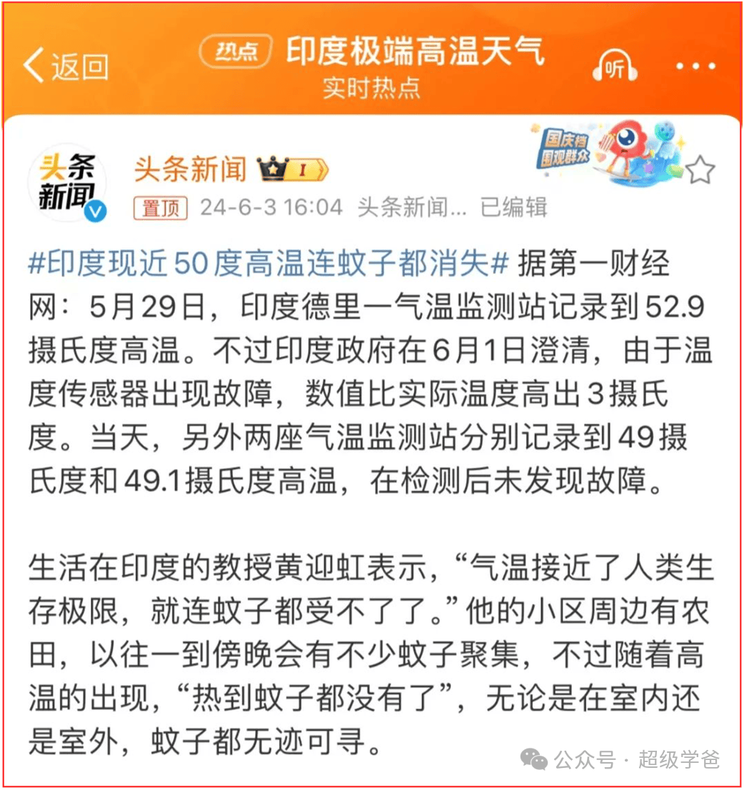 更誇張的是印度的北方邦、比哈爾邦等地,最高氣温長期盤踞在50度左右,夜裏最低氣温也在40度上下。由於温度過高,連蚊子都沒了。