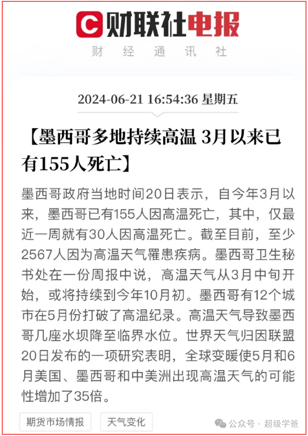 墨西哥也正在經歷一場空前的高温和乾旱。自今年3月以來,墨西哥已經有155人因高温死亡。墨西哥有12座城市在5月打破了高温紀錄,墨西哥的幾座水壩已經降至臨界水位。