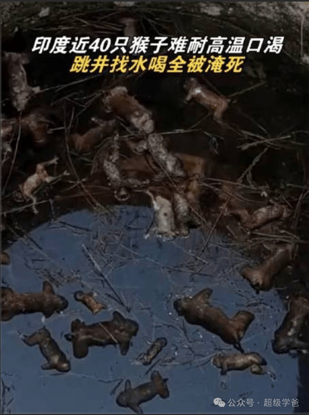 人還好辦一點,那些常年穿着毛皮大衣的動物們就更倒黴了。印度的賈坎德邦東部的帕拉穆地區,村民發現近40只猴子淹死在一口井裏。
