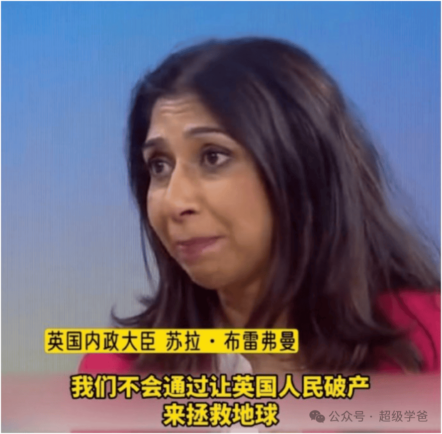 2023年9月21日,英國內政大臣蘇拉·佈雷弗曼説:我們不會通過讓英國人民破產來拯救地球。當初你們要求發展中國家減排,可不管人家破產不破產。