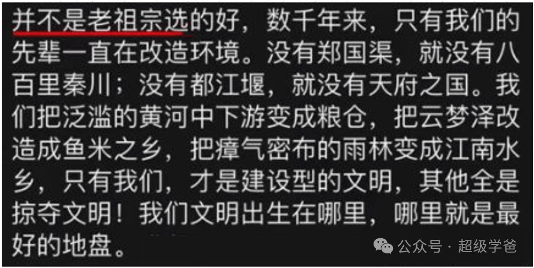 最後他得出結論:只有我們(中華文明),才是建設型的文明,其他全是掠奪型的文明。我們的文明出生在哪裏,哪裏就是最好的地盤。