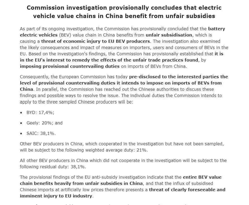 我在之前的文章也説過,從馮.德萊恩宣佈對中國電車發起反補貼調查開始,最後無論什麼結果,加收懲罰性關税都是必然的。