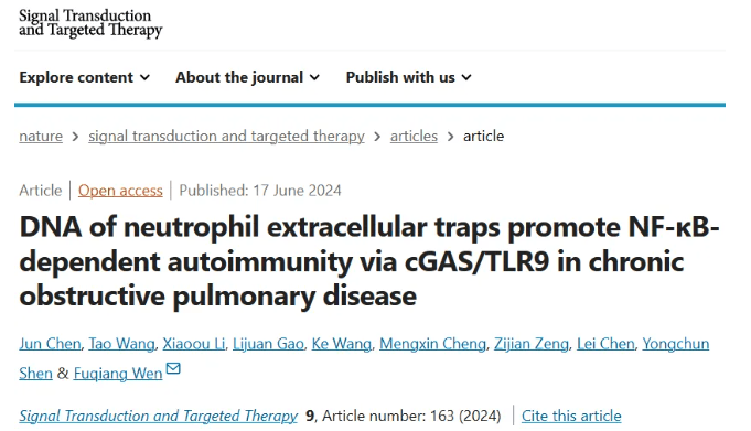 2024年6月17日,四川大學文富強團隊在Signal Transduction and Targeted Therapy 發表題為“DNA of neutrophil extracellular traps promote NF-κB-dependent autoimmunity via cGAS/TLR9 in chronic obstructive pulmonary disease”的研究論文,該研究本研究旨在闡明COPD中NET的免疫調節機制,採用人中性粒細胞、氣道上皮細胞(AEC)、樹突狀細胞(DC)和長期CS誘導的 COPD 小鼠模型,以及環磷酸鳥苷-單磷酸腺苷合酶和 toll樣受體9敲除小鼠(cGAS−/−,TLR9−/−);此外,還檢查了 COPD 患者的支氣管肺泡灌洗液(BALF)。COPD患者的中性粒細胞由於線粒體呼吸鏈功能障礙而釋放更多的香煙煙霧提取物(CSE)誘導的NETs (CSE-NETs)。這些含有氧化損傷DNA (NETs-DNA)的CSE-NETs促進AECs增殖,核因子-κB (NF-κB)活化,NF-κB依賴性細胞因子和i型干擾素的產生,以及DC成熟,這些作用被沉默/抑制cGAS/TLR9所改善/逆轉。