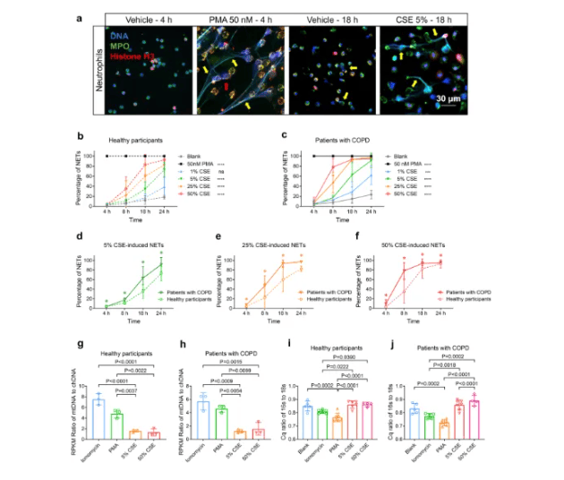 慢性阻塞性肺疾病(COPD)的特徵是即使在戒煙後仍持續存在氣道炎症。中性粒細胞胞外陷阱(NET)與COPD的嚴重程度和短期香煙煙霧(CS)誘發的急性氣道炎症有關。然而,NETs是否以及如何導致COPD的持續性氣道炎症仍不清楚。