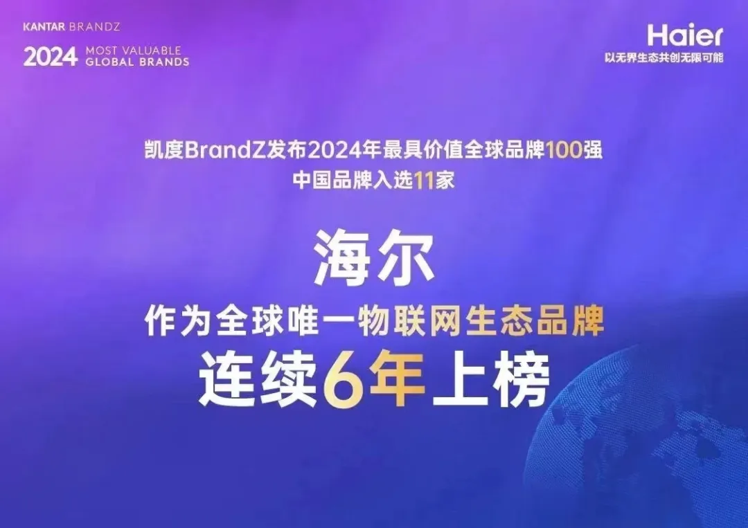 拿有着品牌界“奧斯卡“之稱的凱度BrandZ最具價值全球品牌100強榜單來説,海爾已連續6年以唯一物聯網生態品牌上榜,且排名持續攀升;而世界品牌實驗室發佈《中國500最具價值品牌》,海爾連續21年上榜,並蟬聯前三,並被評價為“2024年度最佳表現品牌”。