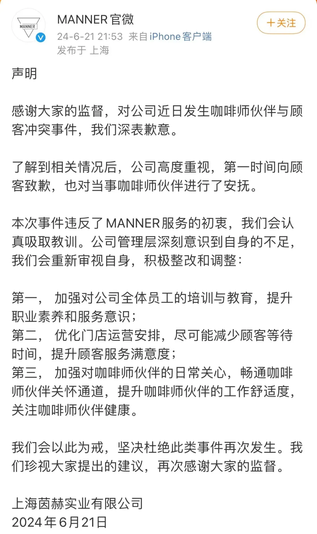Manner咖啡官方微博正式發佈聲明,對近日發生的咖啡師與顧客衝突事件,深表歉意,並表示將“優化門店運營安排”。