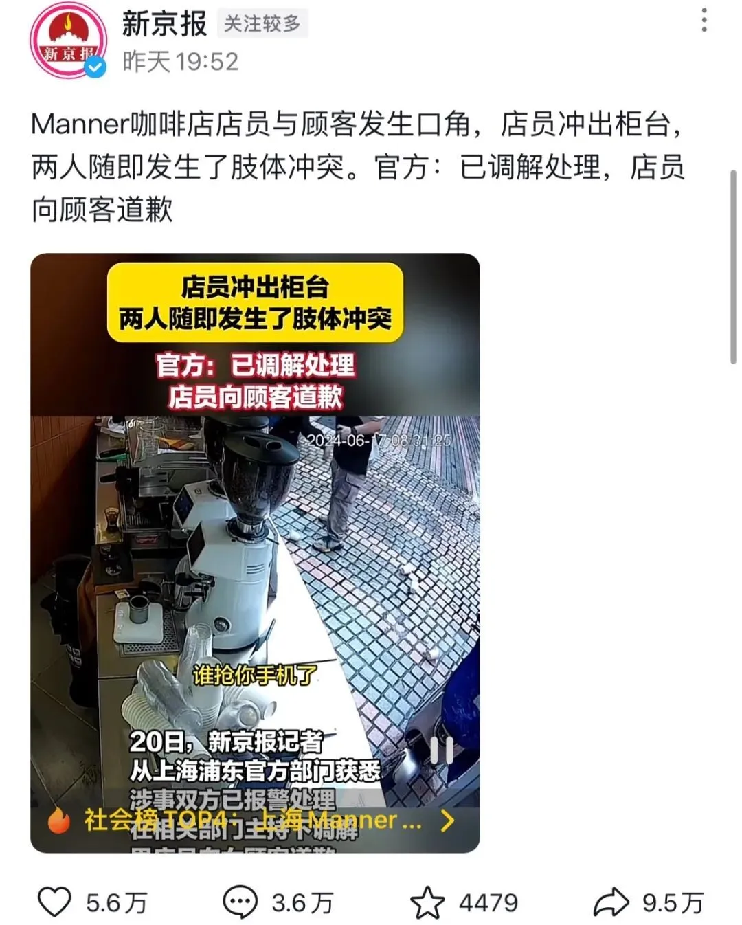 曾經在Manner做過店長的一位行業人深表認同:“這件事情沒有絕對的對錯,但衝突升級到動手打人肯定是不對的,顧客和咖啡師包括品牌都有責任。”