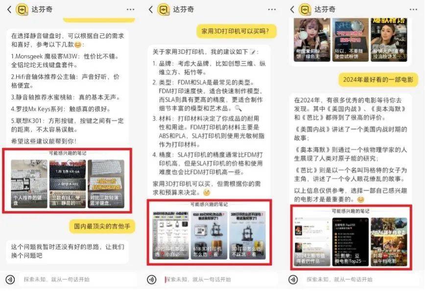 ▲提問“2024最好看的一部電影”、“最好用的一把靜音鍵盤”、“家用3D打印機可以買嗎”等問題