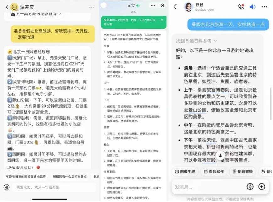 ▲提問“暑假去北京旅遊,幫我安排一天行程,一定要地道”,達芬奇/元寶/豆包作答