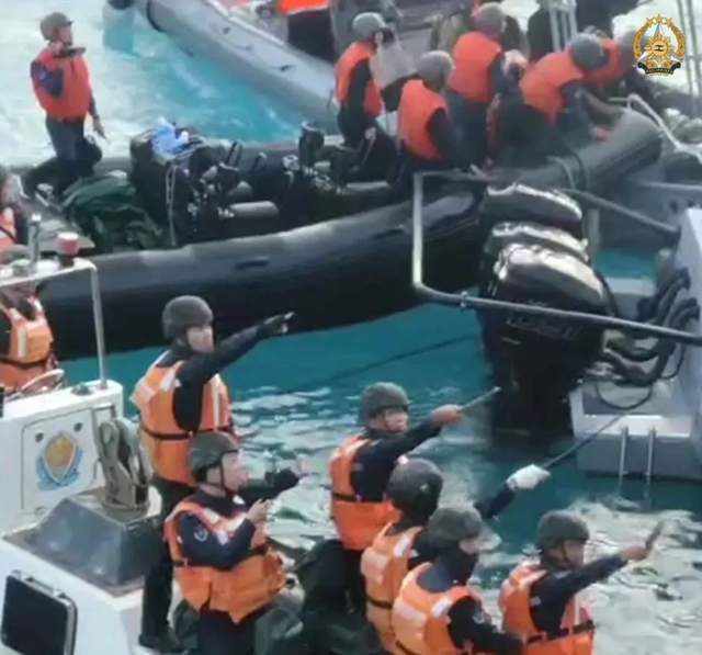 中方強調,中國海警執法時,菲方武裝人員向中方執法人員投擲重物,非法“坐灘”人員潑灑了不明液體,是蓄意的襲警犯罪。