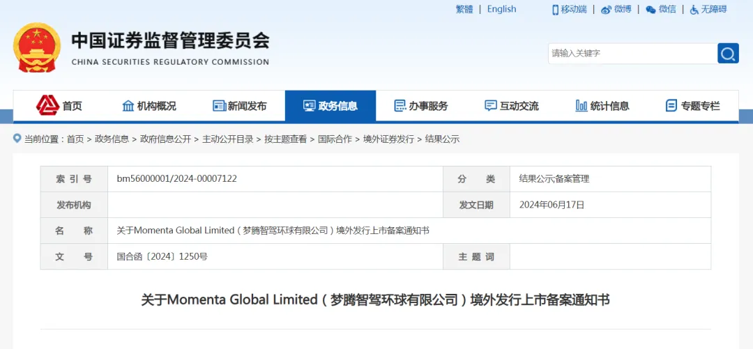 近日,證監會發布關於Momenta Global Limited(夢騰智駕環球有限公司)境外發行上市備案通知書。證監會已收悉Momenta Global Limited通過境內運營實體魔門塔(蘇州)科技有限公司提交的境外發行上市備案材料。該公司擬發行不超過6335.29萬股普通股並在美國納斯達克證券交易所或紐約證券交易所上市。證監會指出,自備案通知書出具之日起至本次境外發行上市結束前,如公司發生重大事項,應根據境內企業境外發行上市有關規定,通過中國證監會備案管理信息系統報告。公司完成境外發行上市後15個工作日內,應通過中國證監會備案管理信息系統報告發行上市情況。若該公司自本備案通知書出具之日起12個月內未完成境外發行上市,擬繼續推進的,應更新備案材料。通知書顯示,本備案通知書僅對企業境外發行上市備案信息予以確認,不表明中國證監會對該企業證券的投資價值或者投資者的收益作出實質性判斷或者保證,也不表明中國證監會對企業備案材料的真實性、準確性、完整性作出保證或者認定。綜合 | 證監會 澎湃新聞 財聯社 編輯 | Arti
