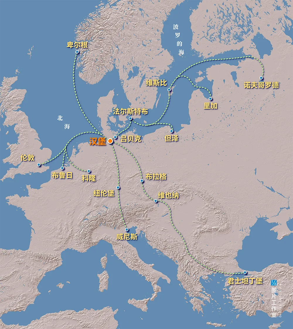 其中,漢堡擁有連通北海、波羅的海和歐洲大陸的絕佳區位自古便是北海和波羅的海之間的貿易樞紐。1189年5月7日,「紅鬍子」腓特烈一世親自賦予他「帝國自由市」稱號和北海貿易免税權。