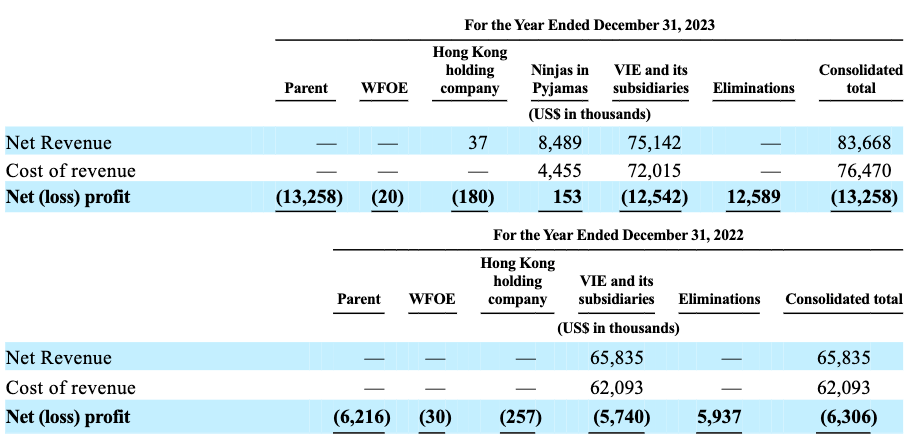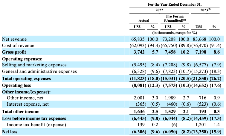 只是這條路能否帶領星競威武擺脱虧損困境,還有待時間的檢驗。星競威武人才經紀業務至今仍處於毛虧狀態。2022年和2023年,該業務毛虧損分別為90萬美元和80萬美元,毛利率為-2.3%和-1.6%。