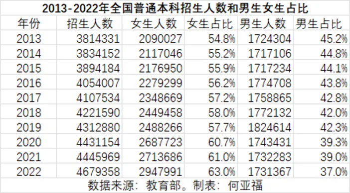 從上表可以看出,2013年全國普通本科招生人數中,女生佔比為54.8%,男生佔比為45.2%;到了2022年,普通本科招生人數中,女生佔比上升到63%,而男生佔比則下降到37%。