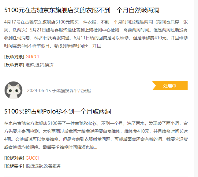 在線上平台,GUCCI購買的衣服出現損壞,要求GUCCI退貨退款,GUCCI卻無法滿足客户需求。在近些年來的媒體報道中,GUCCI先後被曝女子在GUCCI品牌店試衣服被店員辱罵;消費者花費8500元買的老爹鞋,剛穿一週就開膠了,店員卻稱“這不是質量問題”等事件。