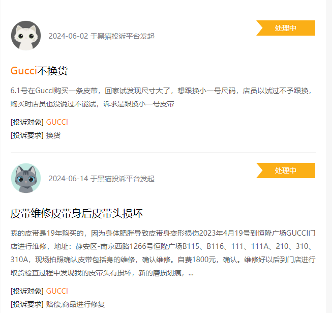 但開雲集團在中國市場的銷售培訓明顯不夠,甚至可以説是缺乏同理心。在黑貓投訴上,有消費者投訴稱,在GUCCI線下門店購買的皮帶尺寸不合適,門店不進行換貨。皮帶維修後出現質量問題,不進行維修。
