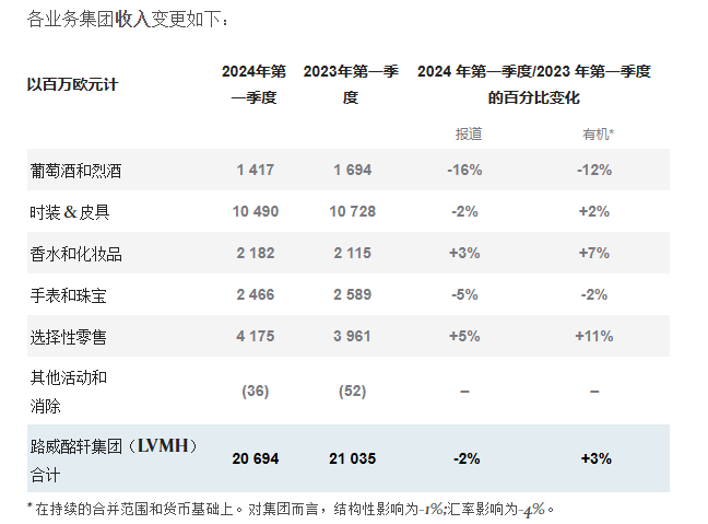LV旗下軒尼詩干邑白蘭地受美國謹慎補貨和中國農曆新年期間需求疲軟影響,2024年Q1葡萄酒和烈酒有機營收暴跌12%,成為LV業績下滑最嚴重的業務,直接拖累LV該季度業績增長。