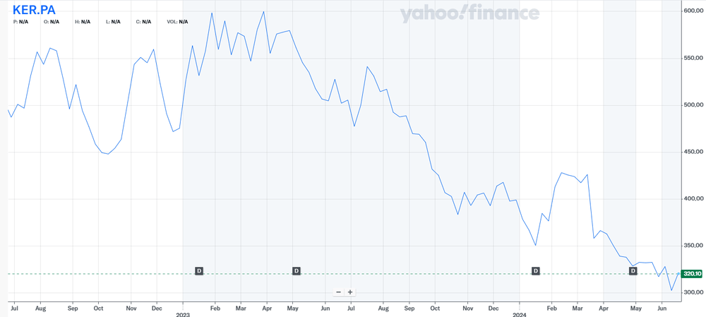 業績持續惡化,開雲集團股價從2023年7月527美元/股狂跌至今年的320.1美元/股,跌幅比例近40%。拉長時間線來看,近兩年開雲集團股價一直處在下行區間。