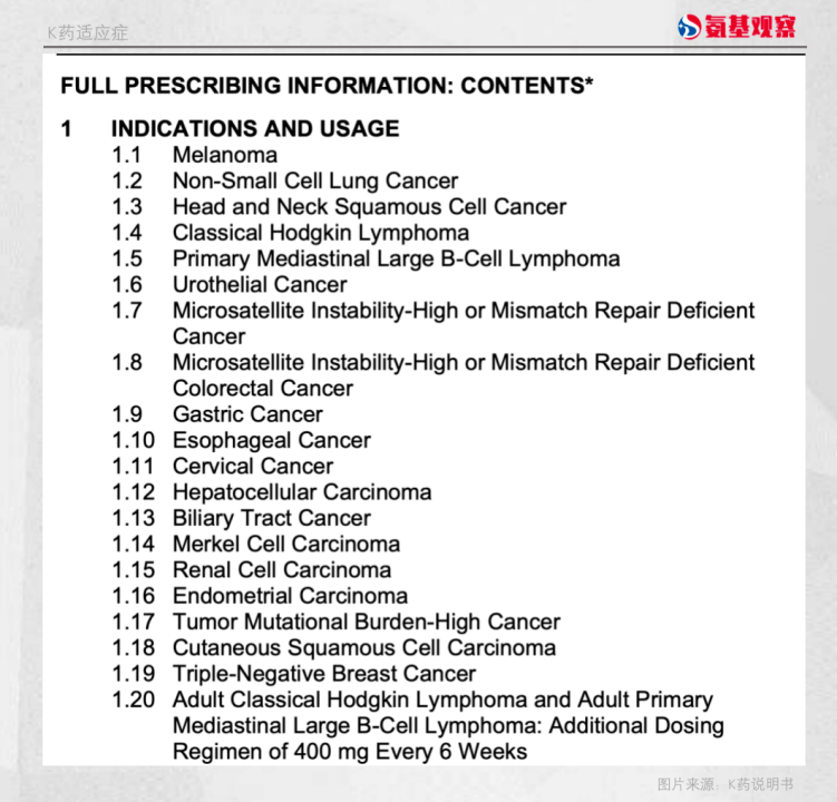 截至目前,K藥已在美國獲批40個適應症,如下圖K藥説明書所示,覆蓋黑色素瘤、肺癌、肝癌、頭頸癌等20個癌種,其中包括多個一線治療。