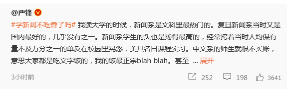 #學新聞不吃香了嗎# 我讀大學的時候,新聞系是文科裏最熱門的。復旦新聞系當時又是國內最好的,幾乎沒有之一。新聞系學生的頭也是揚得最高的,經常挎着當時人均保有量不及萬分之一的單反在校園裏晃悠,美其名曰課程實習。中文系的師生就很不買賬,意思大家都是吃文字飯的,我的飯最正宗blah blah。甚至有大報偏愛中文系,新聞系去廠報當記者的傳言,現在看來也無非是同行相輕,以偏概全。