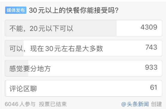 前不久,頭條新聞發起了一項關於“30元以上的快餐你能接受嗎”的調查問卷,在6000多個調查樣本中,只有743人認為“可以接受”,而超過4300人明確表示“不能”。